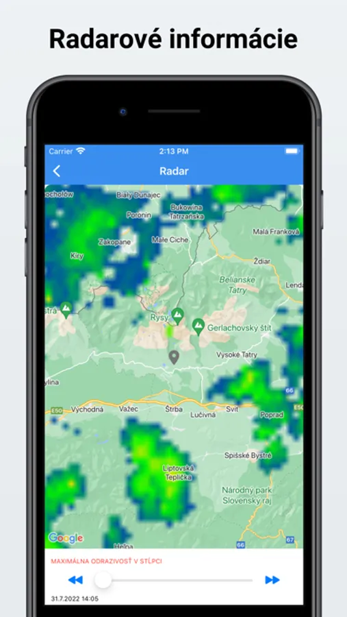 - radarové snímky s animáciami na mapovom podklade