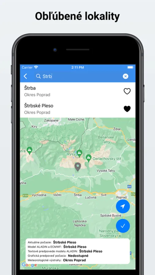 - označenie lokality ako obľúbenej pre rýchlejší prístup k predpovedi