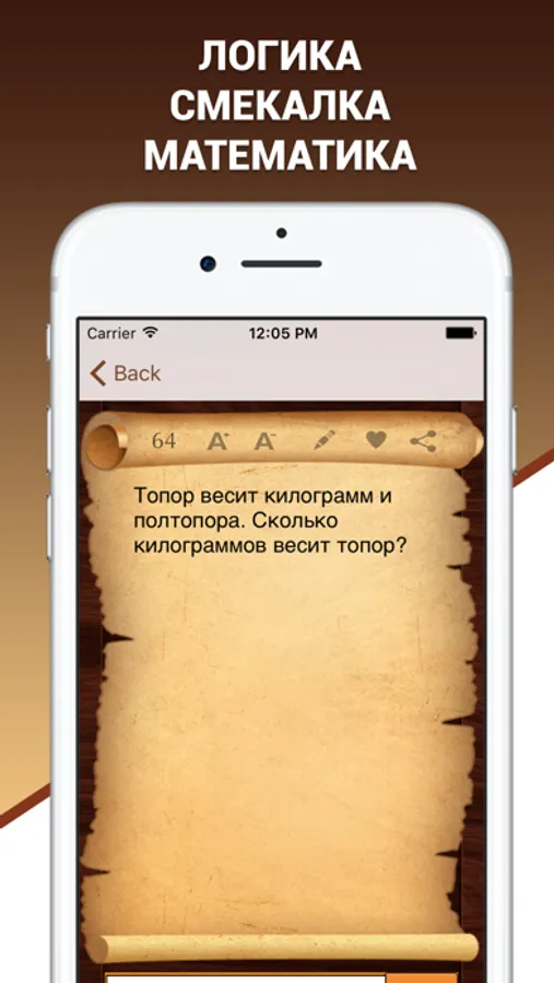 Скачай полную версию викторины логических задач «Эврика!», в которой тебя ждет больше самых интересных задач, возможность посмотреть ответ нерешенной головоломки и отключена реклама!