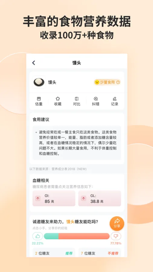 【食物查询】方便快速地查询食物热量、碳水含量、GI/GL数值以及其它多种营养元素的含量,让您吃得明白,吃得安心。
