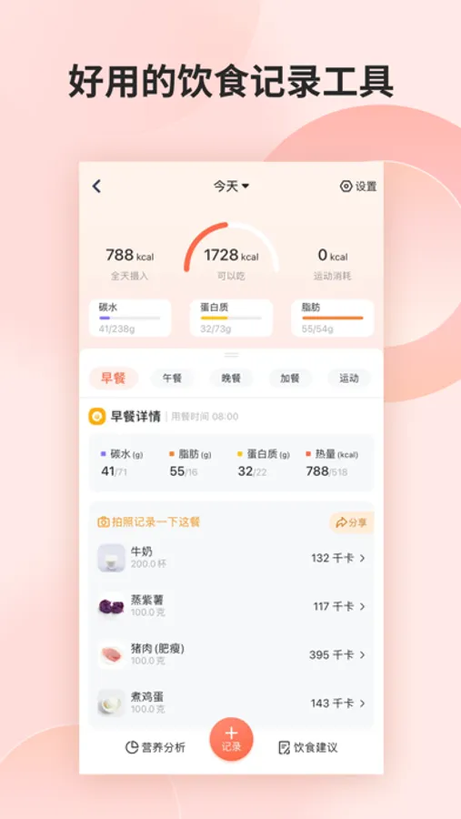 【饮食记录】简单方便记录饮食和运动,统计热量和各营养素,让您简便高效地控卡、控糖和控碳水。