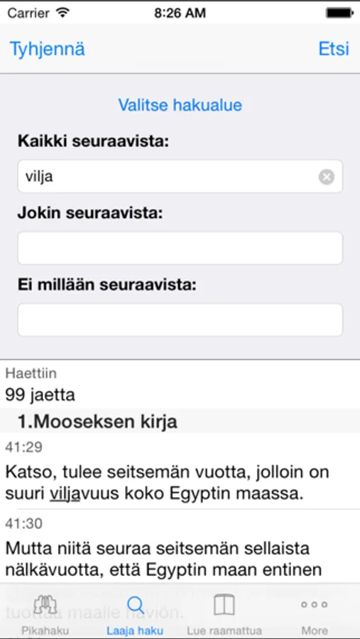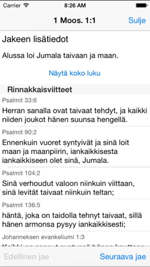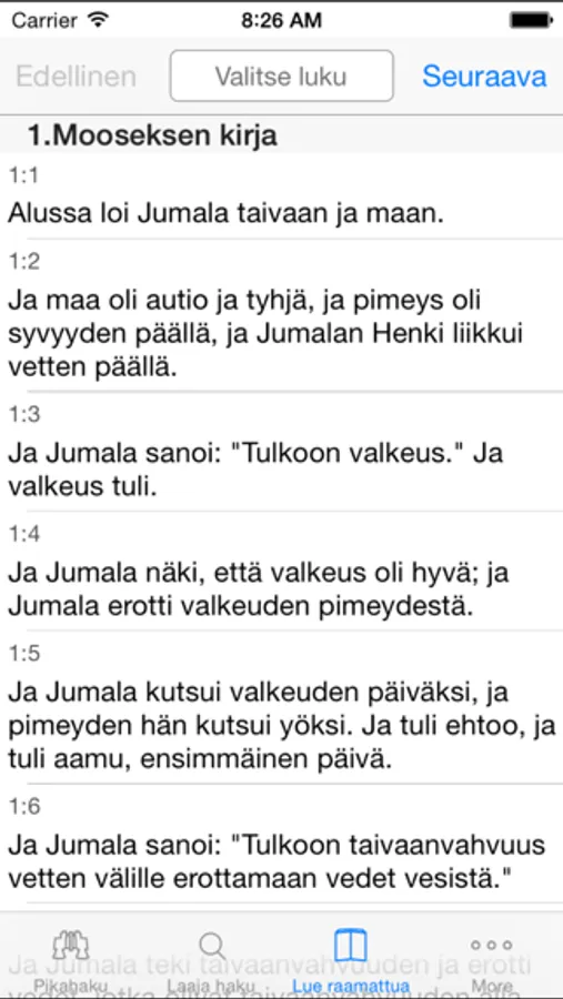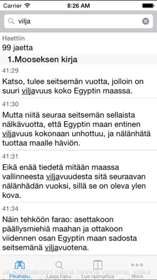 Raamattu taskussasi. Hae Raamatusta ja lue Raamattua helposti ja monipuolisesti suomeksi, ruotsiksi ja englanniksi. Jakeiden takaa löytyvät rinnakkaisviitteet ja jakeen eri kieliversiot. Haku onnistuu 33/38-kirkkoraamatusta ja luettavat käännökset sen lisäksi ovat vanha Biblia, ruotsi 1917 ja King James Version (KJV). Kyseessä on suositun Koivuniemen Raamattuhaun (www.koivuniemi.com/raamattu) sovellusversio.