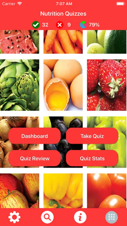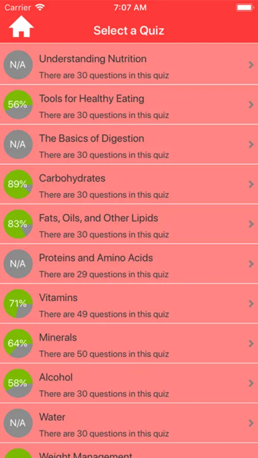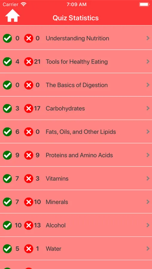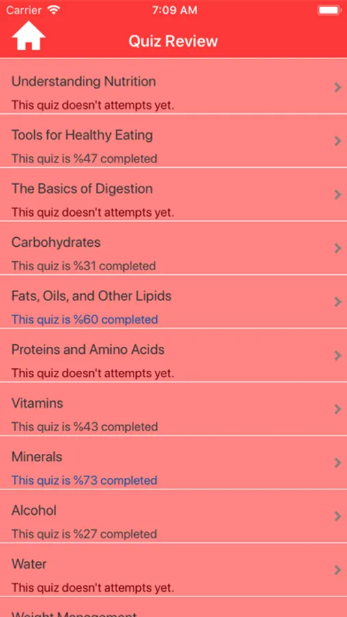 - You can review a quiz session performance details by selected a session. This screen shows quiz history performance reports.