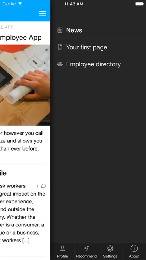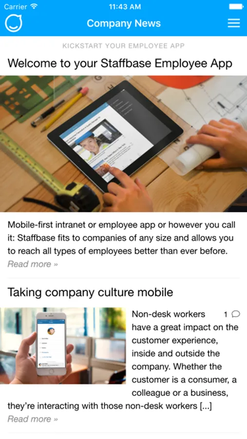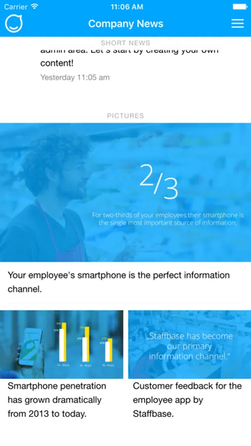 Staffbase is the employee app for all employees. Companies publish news, work-related information, sales material, HR updates, meal plans and whatever else might be important for your organization. With Staffbase on your phone you receive those updates on the go. Always be up to date. No intranet access required. Works without an @company.com email address.