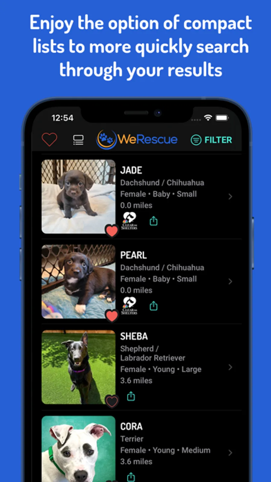 Share the love: WeRescue lets you share pets on social media, SMS text, Pinterest, Facebook, Twitter, WhatsApp, and more. Even if you're not ready to adopt, you can help spread the word and save lives by sharing beautiful images with friends. They'll see the exact pet you shared when they open the WeRescue app, making it easy for them to learn more and potentially adopt.