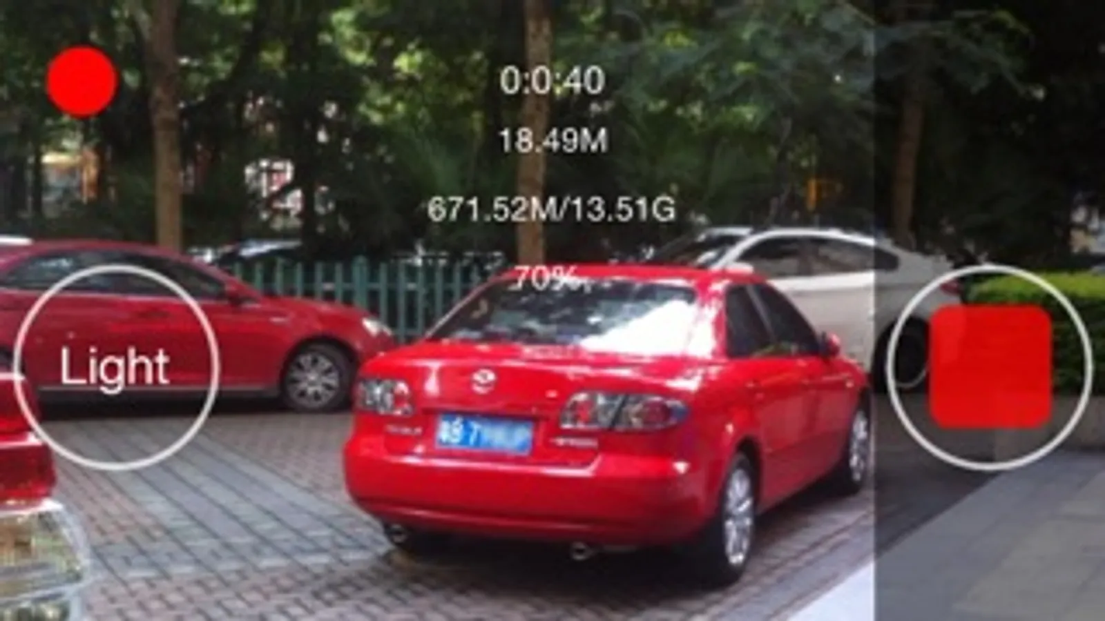 - 录像时长、录像占用空间、磁盘剩余空间、手机剩余电量、充电状态 实时显示。