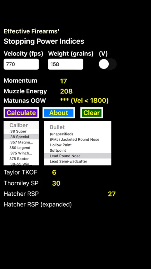 If you also enter bullet form, the Hatcher Relative Stopping Power value is also available (with the expanded value for hollow/soft point).