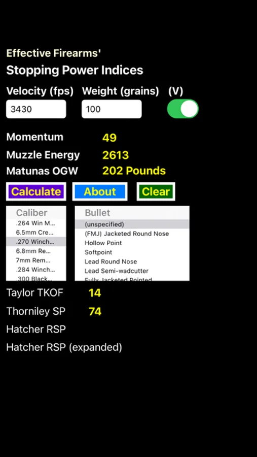 Enter the caliber and you can also display the Taylor Knock Out Factor (TKOF) and the Thorniley Stopping Power.