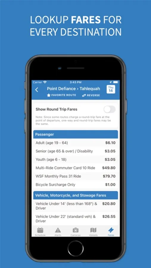 • Round trip and one-way fare schedule for passengers, vehicles, etc.