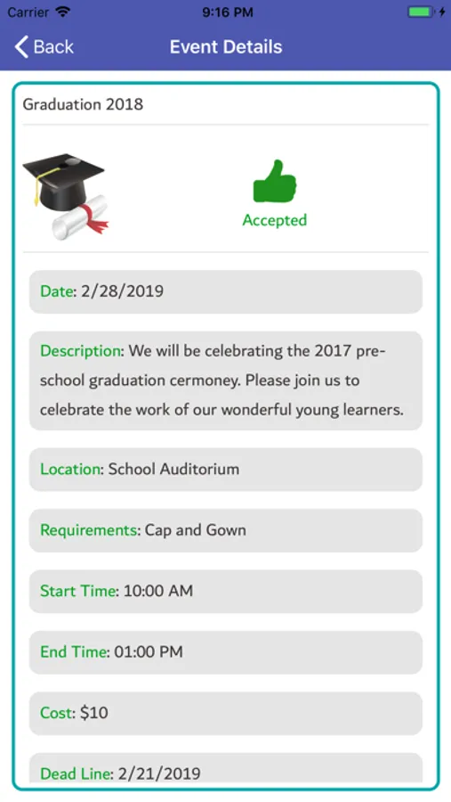 - View child's photos as soon as they are taken whether in class or events and be able to share or save them.