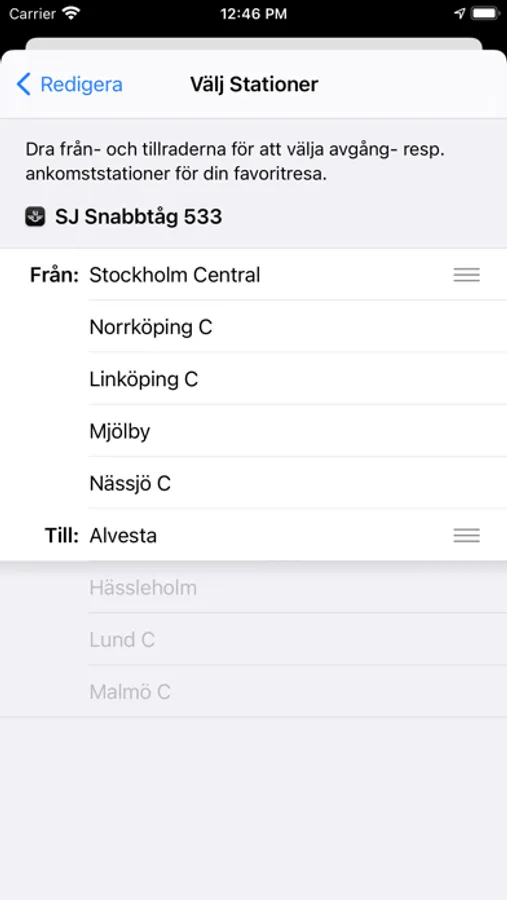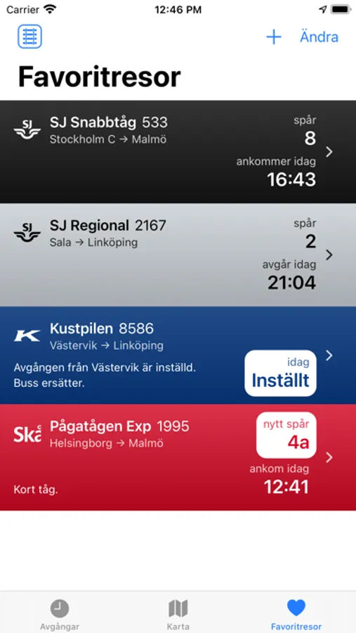 Notiser visas när något uppstår med en av dina favoritresor, till exempel vid försening, spårändring, ändrad vagnsordning eller inställt tåg. Med Tåg har du alltid koll på läget.