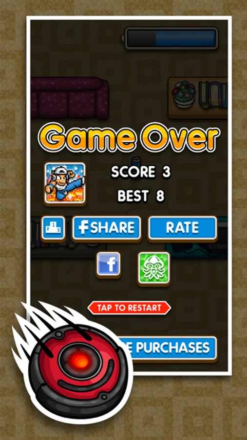 The robot vacuum cleaner is running low on battery. Help it recharge and race as far as possible by reaching the battery power-ups. Avoid bumping into furniture and pet dogs. Enjoy!
