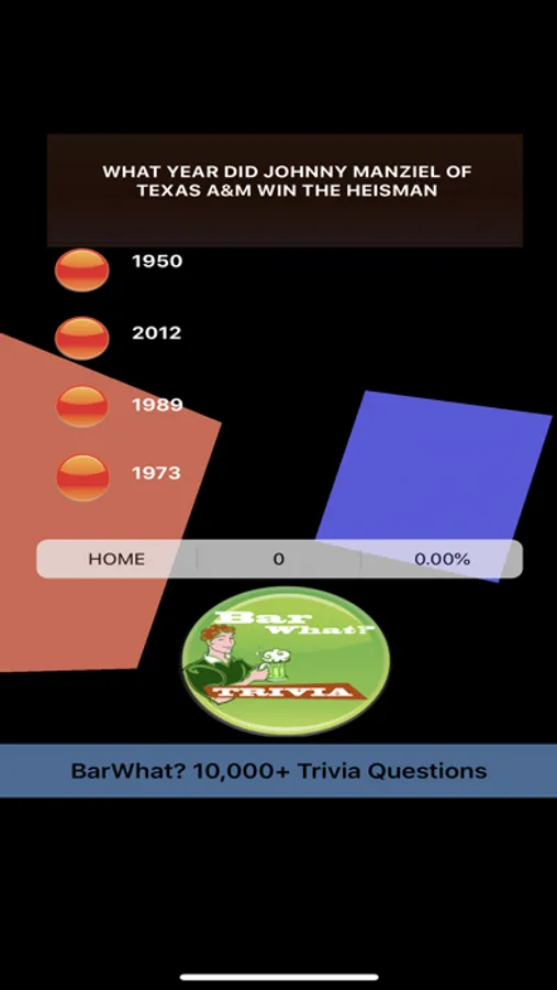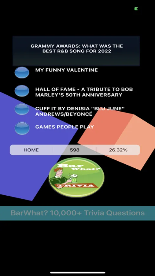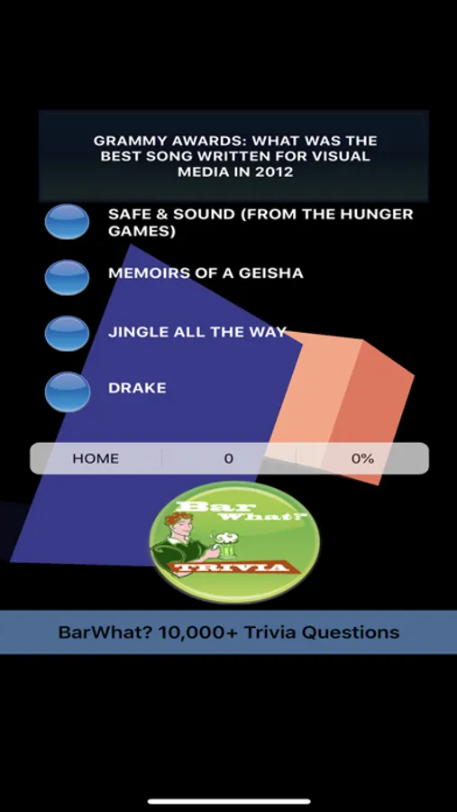 BarWhat? 10000+ Trivia Questions is amazing! BarWhat? features over 10,000 trivia questions. BarWhat? was named to “Best iPad Games Released Ever” critics list by Pocket Gamer! Now available on iPhone, iPad, universal devices! Fun trivia while you play, relax or socialize. BarWhat? 10,000+ Trivia features more than 10,000 unique trivia questions about Grammy Awards 1958 until now, Oscars, BAFTA, Tony Awards, NFL, NCAA, UEFA sports trivia, Hollywood celebrity and famous people trivia, USA Presidents & Vice Presidents trivia, geography trivia, science trivia and more fun!