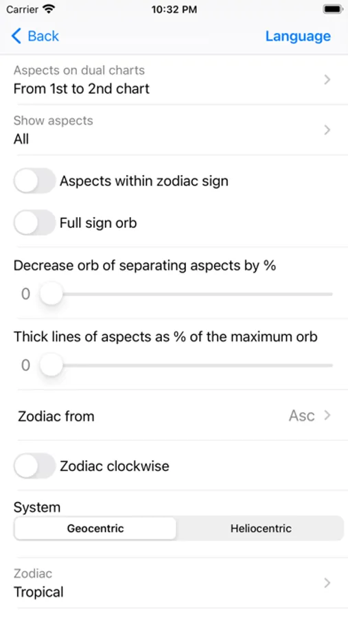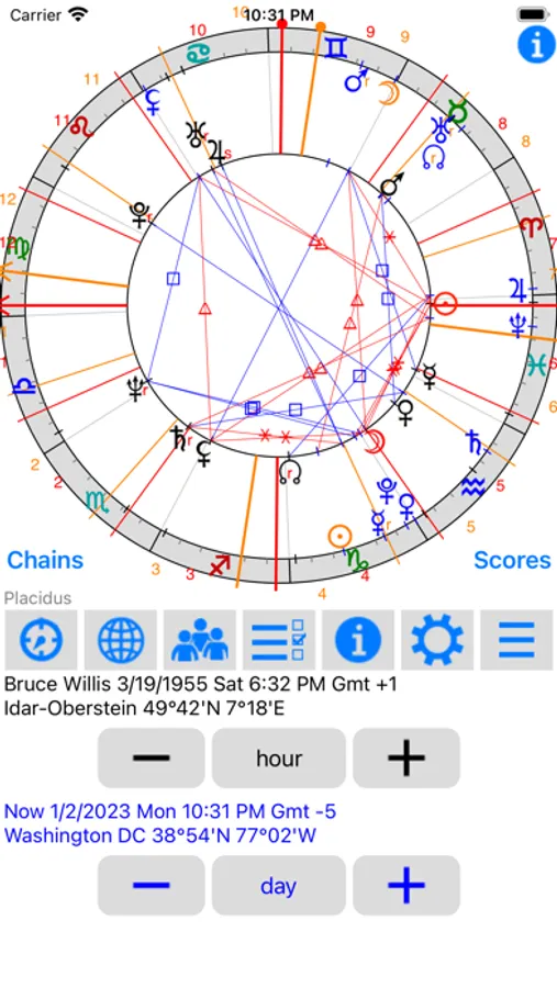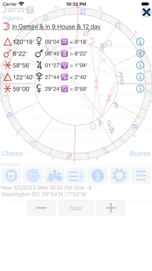 App contains essential and accidental scores table with the ability to customize the order of values calculation. There is a choice of 11 house systems, 20 types of aspect with customizable orbs and database of about 100000 places with specified time zones, so the difference with GMT is determined automatically, besides, you can add new place.