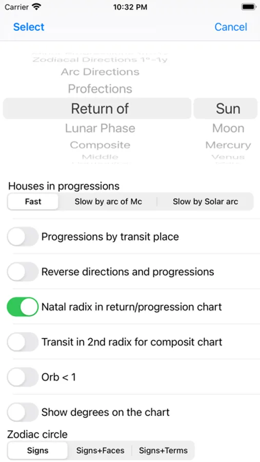 5) Zodiacal Directions (natal chart + 1° = 1 year delta between selected natal data and specified transit data)