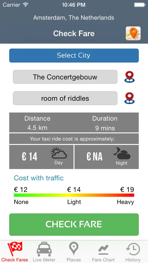 This app help to check taxi fares in all major cities in Netherlands. You can check fares for any two places while sitting at home or office. It also shows path between source and destination address.