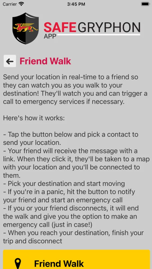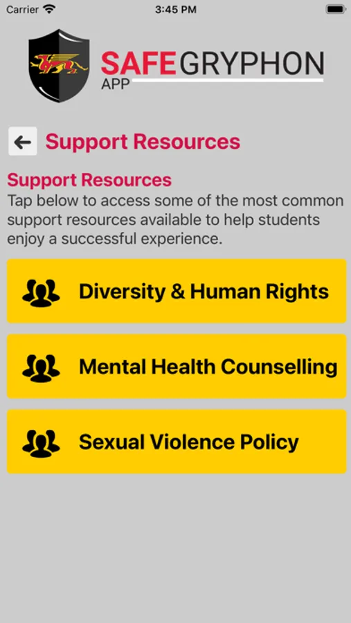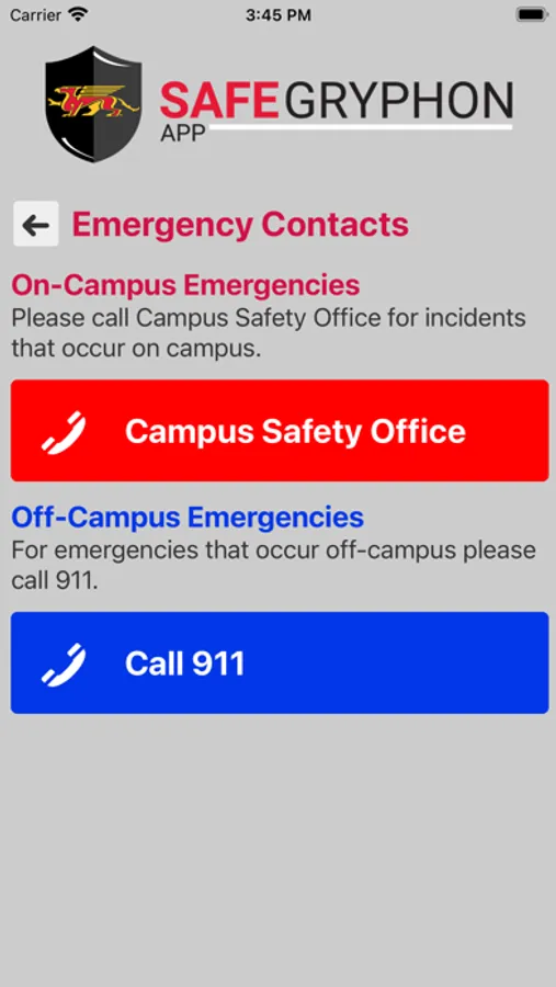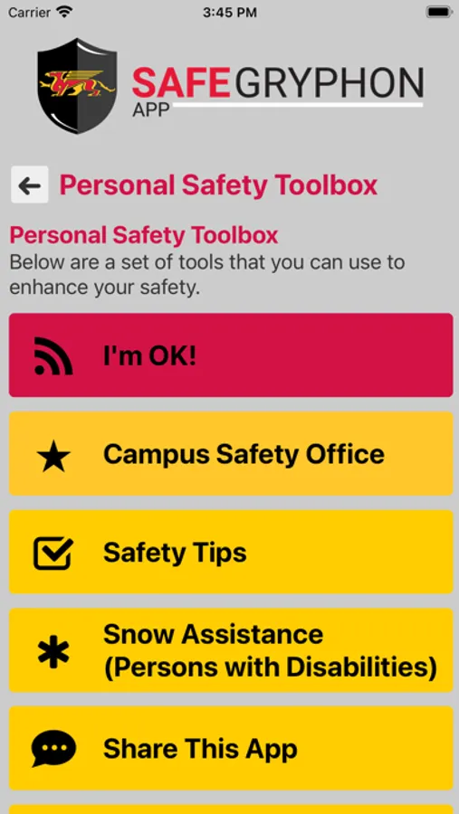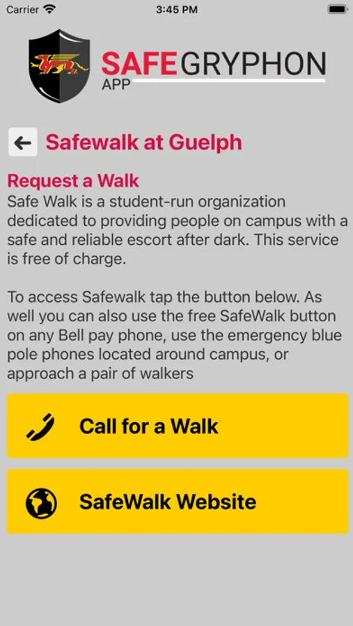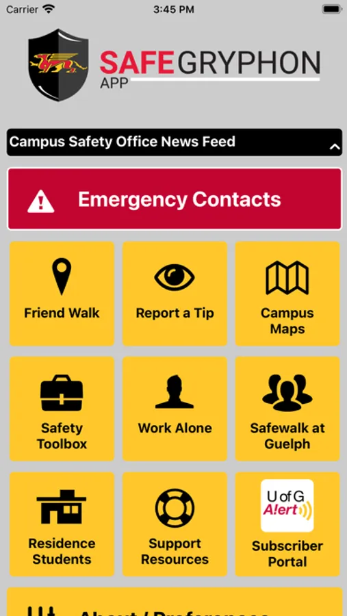 SafeGryphon is the official safety app of University of Guelph. It is the only app that integrates with U of Guelph's safety and security systems. University of Guelph Police Department has worked to develop a unique app that provides students, faculty and staff with added safety on the university campus. The app will send you important safety alerts and provide instant access to campus safety resources.