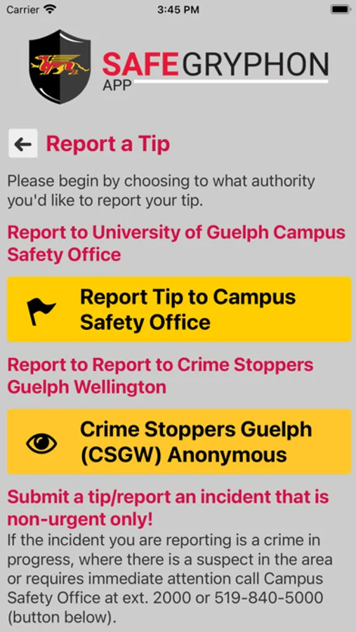 - Tip Reporting: Multiple ways to report a safety/security concern directly to U of Guelph security.