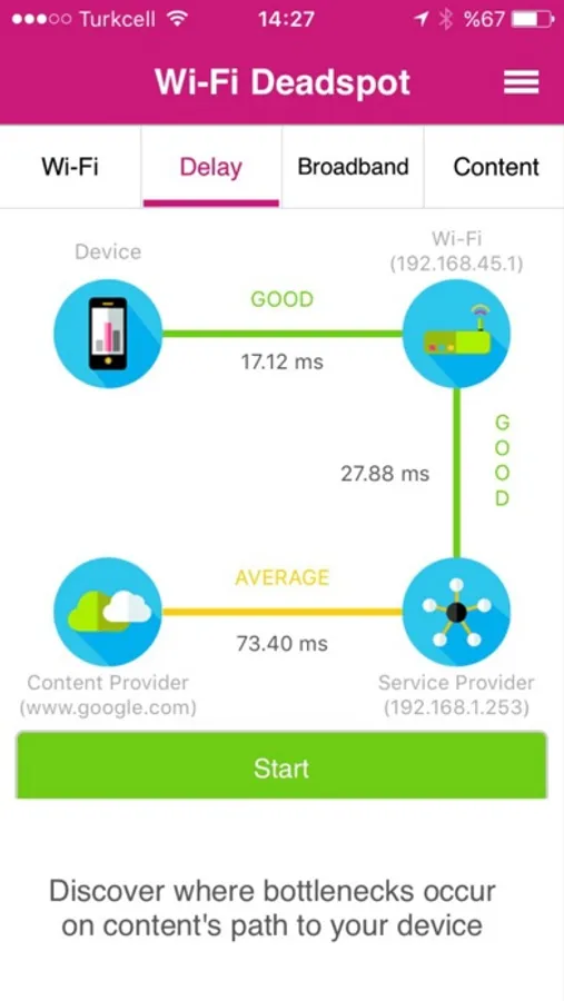 - [Delay] tab tells you how fast your Wi-Fi modem, Service Provider and Content Provider responds to your requests.