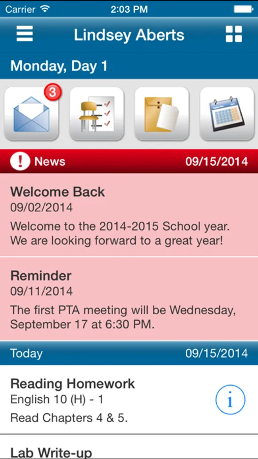 Alerts: Parents will be alerted of important notifications right on the home screen. They can receive unique alerts for things such as: