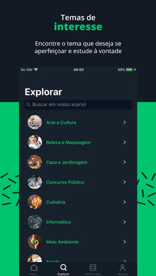 Dentro do aplicativo, você encontra uma gama completa de conteúdo: dezenas de Revistas Digitais com atualização semanal, quinzenal ou mensal, Livros Digitais, Audiolivros e mais de 100 Cursos, todos com certificado de conclusão.