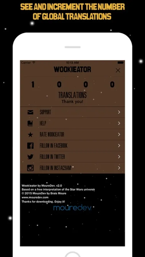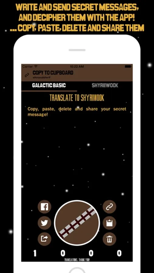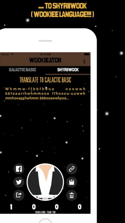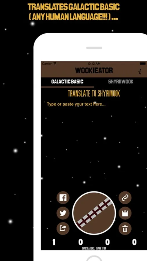 • Translates Galactic Basic (any language... ANY language!) to Shyriiwook (Wookiee language) and vice versa!