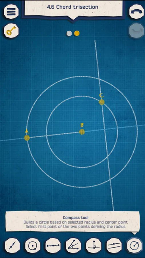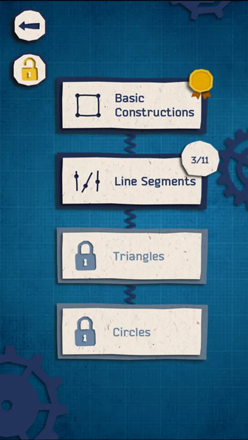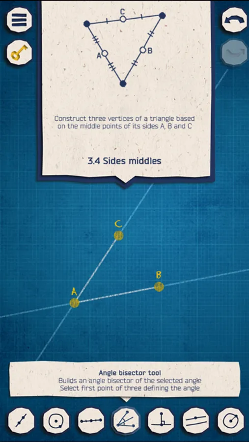 All game levels are divided into four categories: Basic constructions, Line segments, Triangles and Circles. Completing these first levels provide you with new construction tools. These new tools make the completion of more complex levels less tedious – the same way a professional mathematician works.