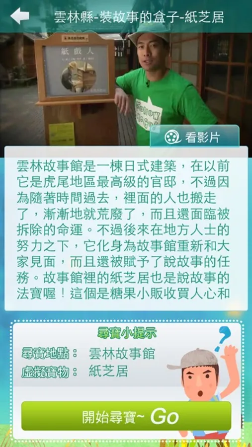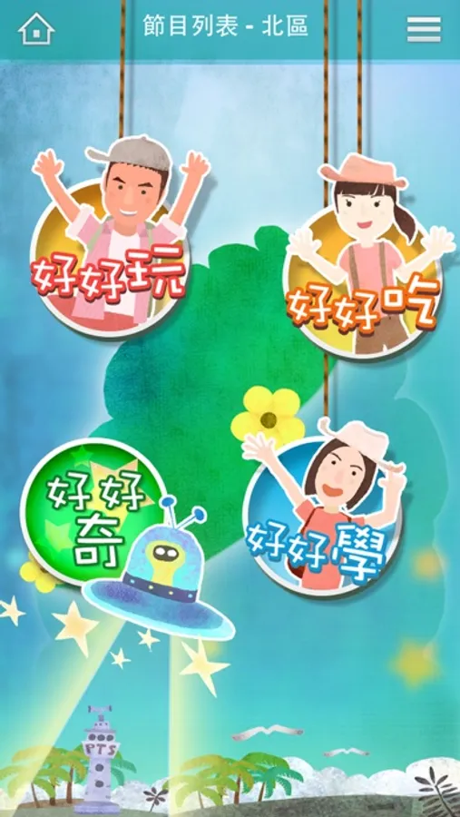 1、尋寶主題:各類主題依地區分北、中、南、東四區;依類型分為「好好吃、好好玩、好好奇、好好學」四類。內含主題介紹短片、文字、劇照和尋寶遊戲。開啟遊戲的話,APP將引導您走一趟主持人的行程。也可以蒐集寶藏,累積個人積分。