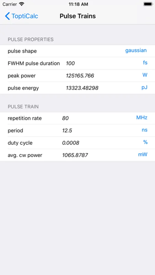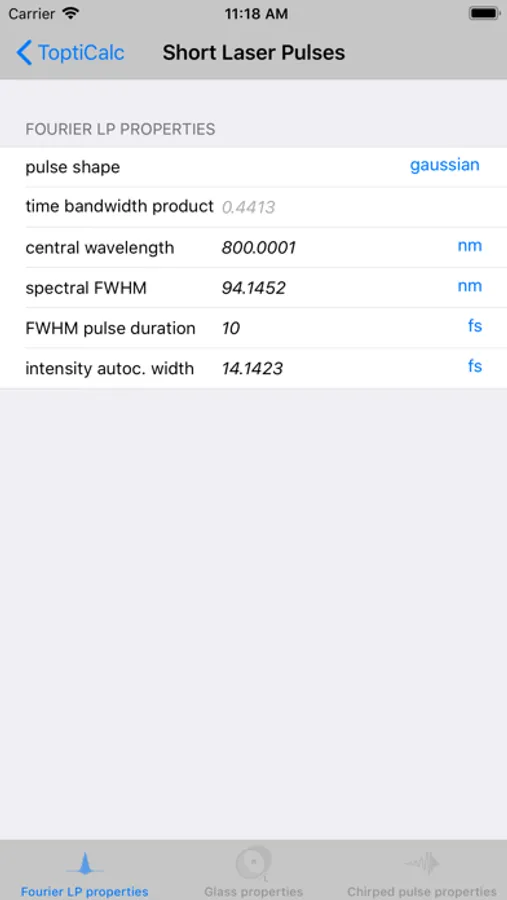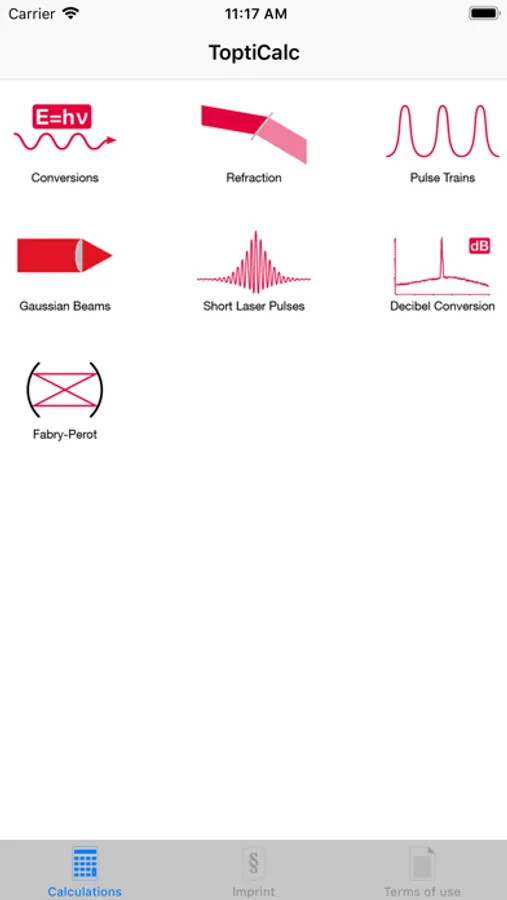 The app offers some frequently used calculations from different areas of laser optics like Spectral Unit Conversion, Fabry-Perot Calculations, Focussing of a Gaussian Beam, Refraction at a Plane Surface, Short laser pulses, Pulse trains and Decibel Conversion.