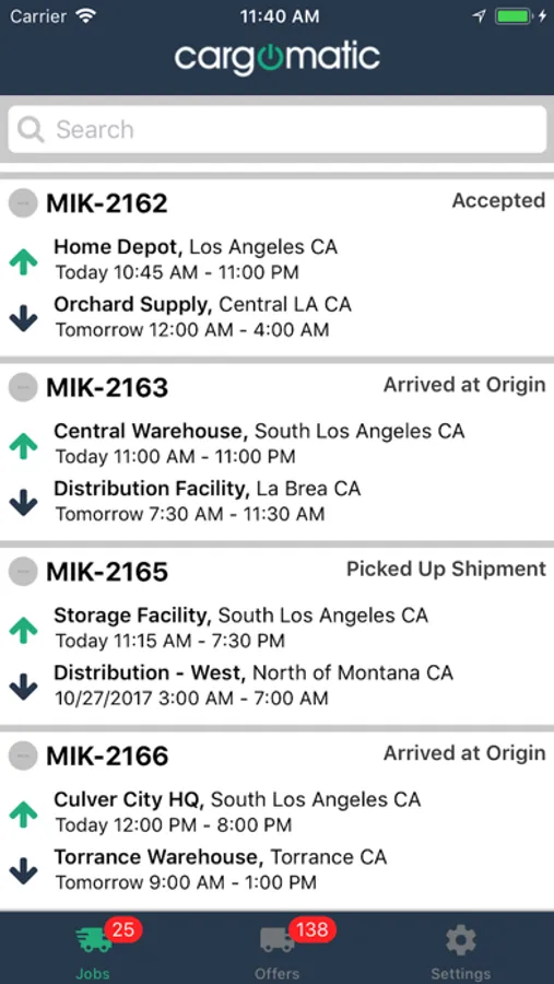 The Cargomatic Driver app allows carriers to manage freight directly from their phone, including: