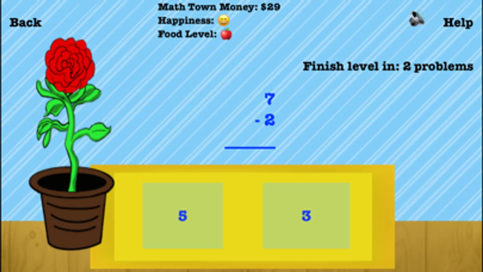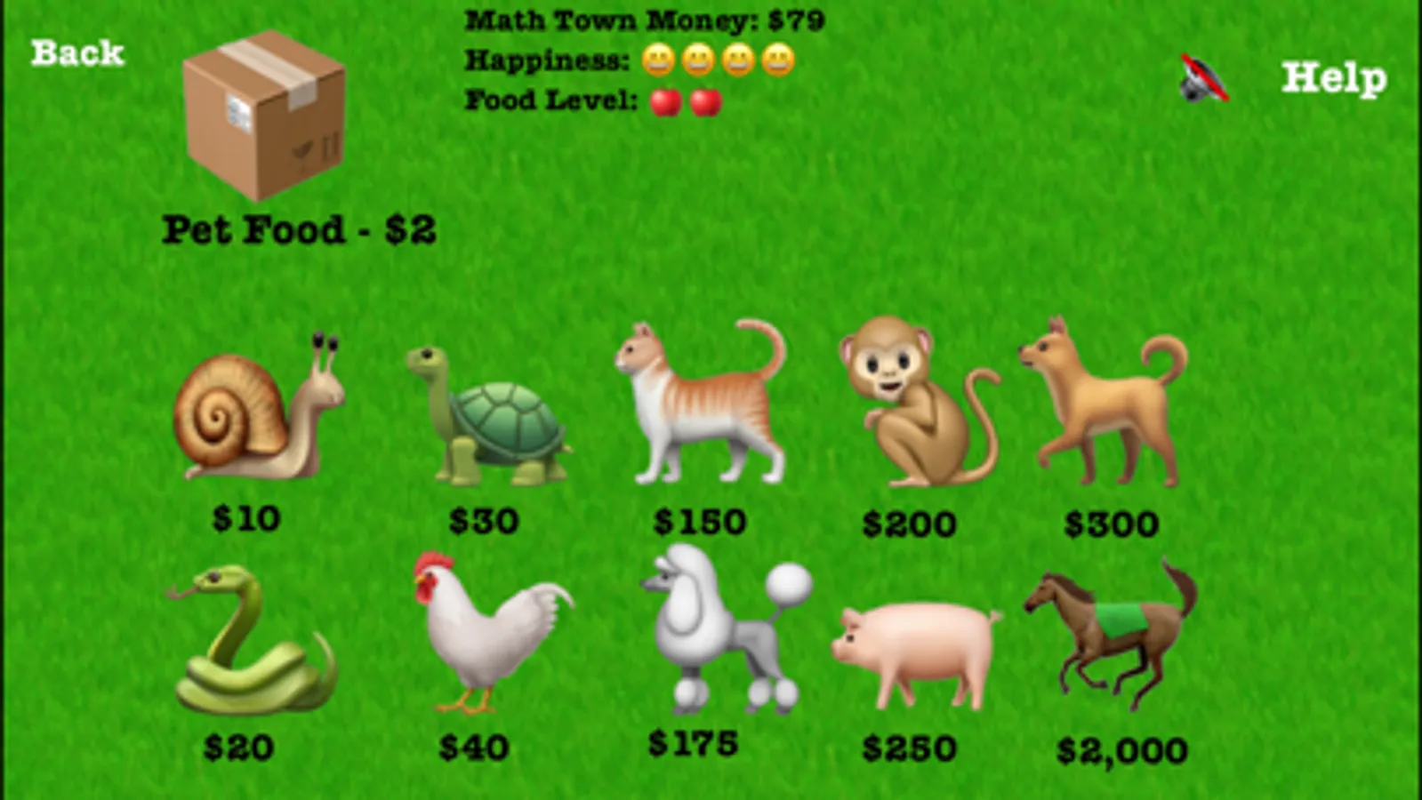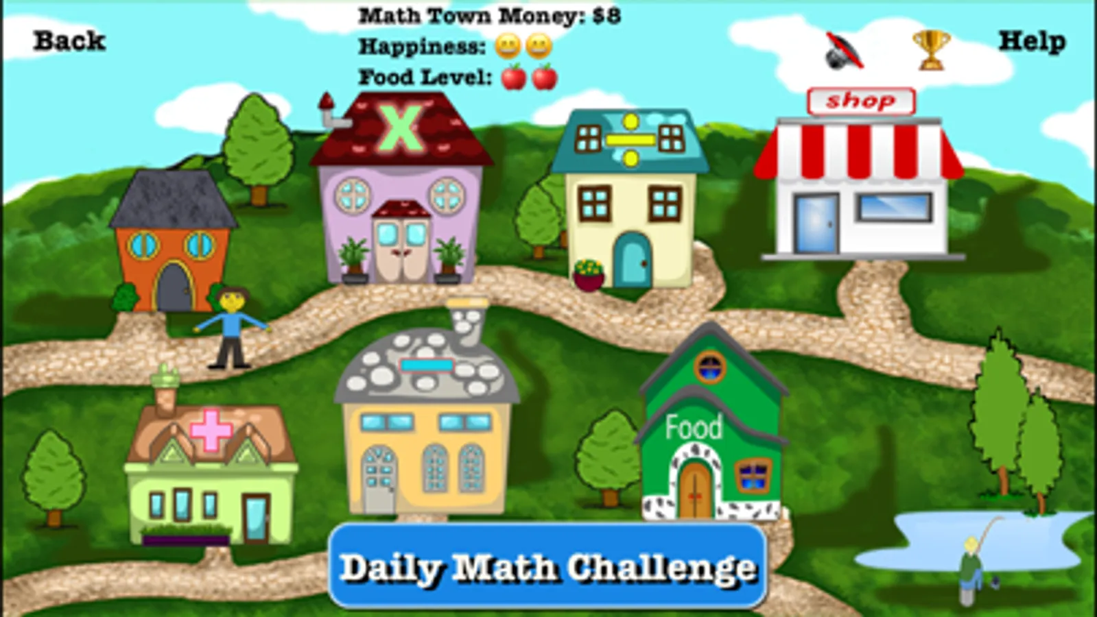 Math Town is a fun, interactive puzzle game where the player earns Math Town Money by solving math problems. While playing the game, you can practice addition, subtraction, multiplication, and division. You can use your Math Town Money to develop your character, buy food from the town store, paint and furnish your house, and even buy a pet to keep you company in Math Town (Don't forget to feed and play with your pet to keep it happy too!).