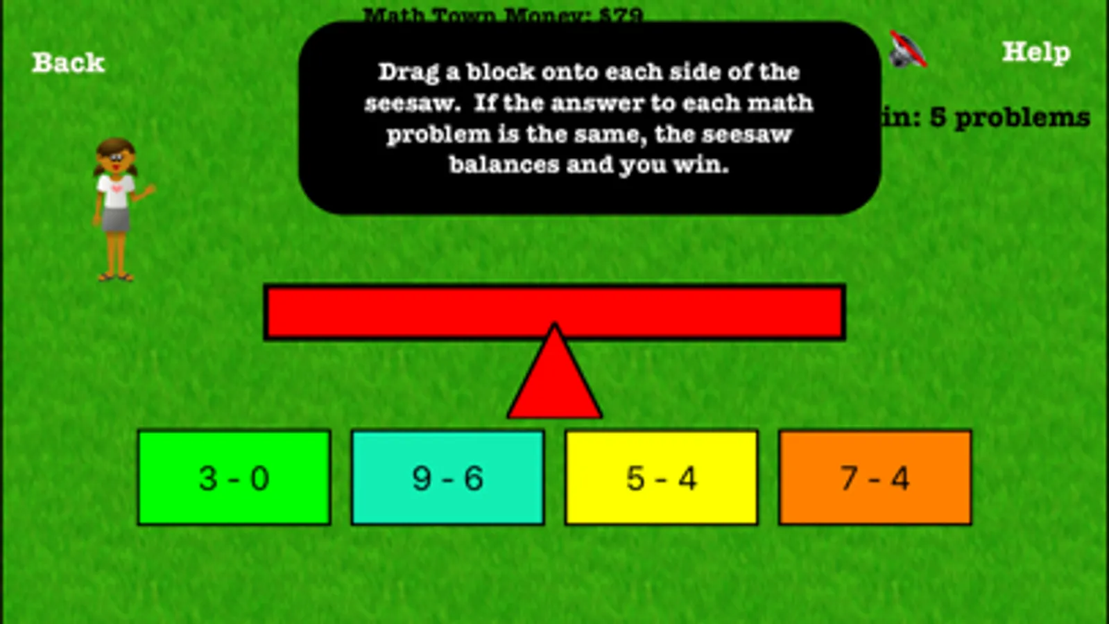 Daily math challenges allow you to earn more Math Town Money to buy your character balloon rides, new wallpaper or paint for your house, and take hikes.