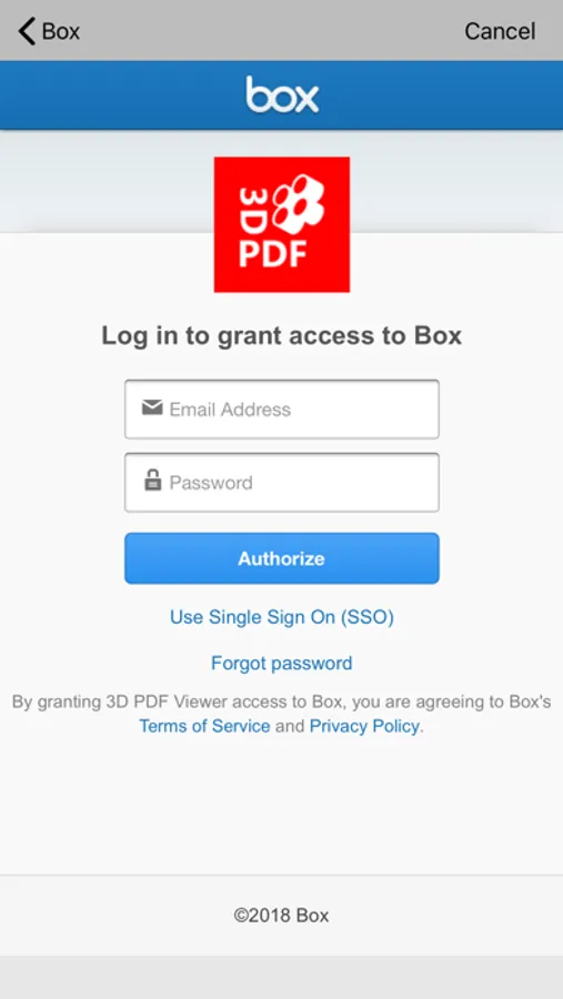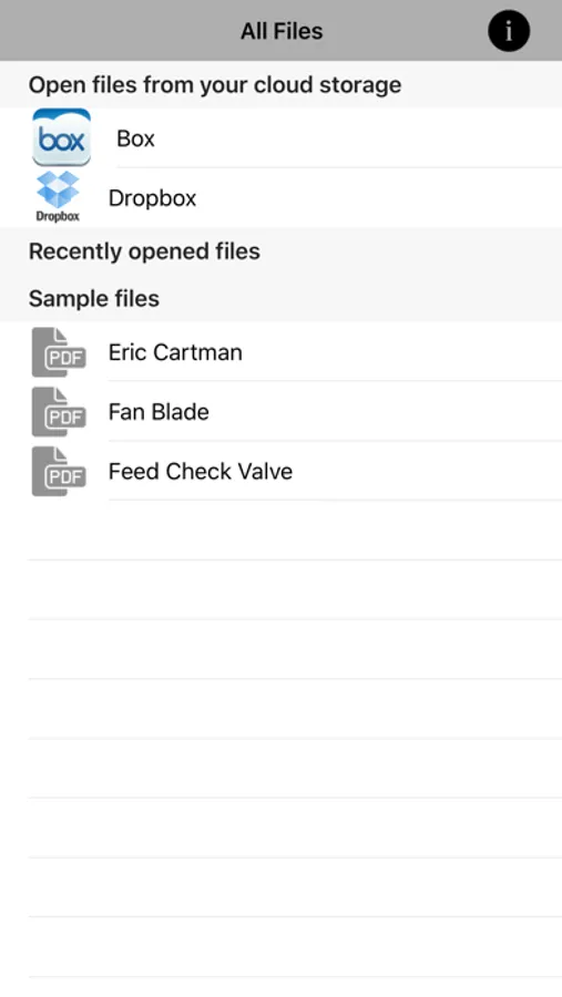 3D PDF Viewer is integrated with Box and Dropbox cloud storage allowing user to directly browse files on Box.com and Dropbox.com storage in the application itself. Three sample 3D PDFs are bundled with the application.