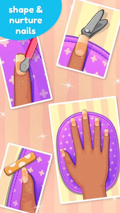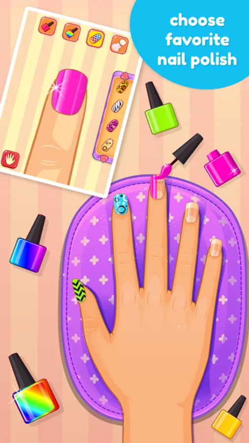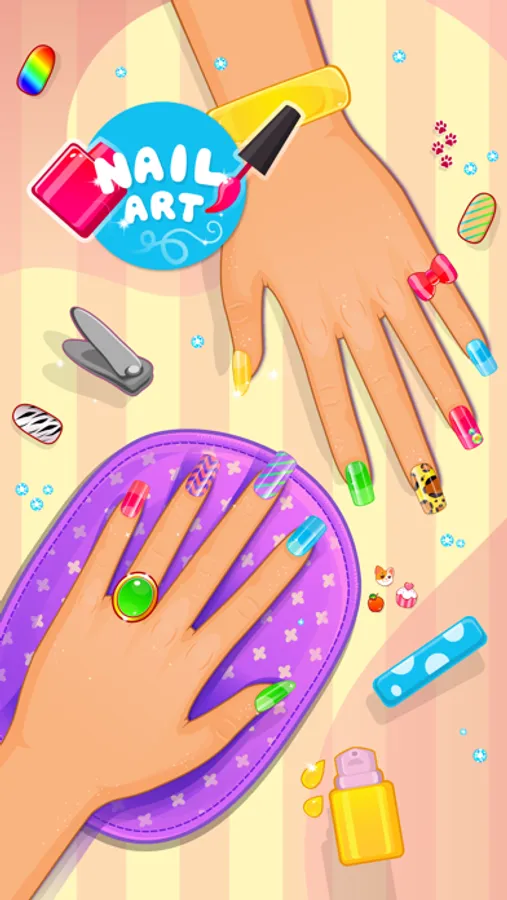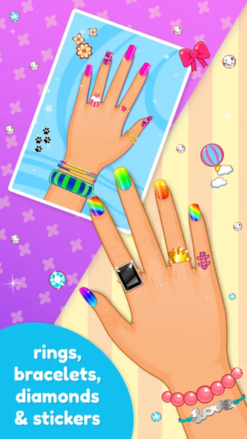 After general nail care, you can finally do your nails, one by one. You have many beauty products at your disposal, for example nail polish of different colors, nail polish removers, stickers, diamonds, glitters and sprinkles, in the end you can even decorate your hand with rings and bracelets.