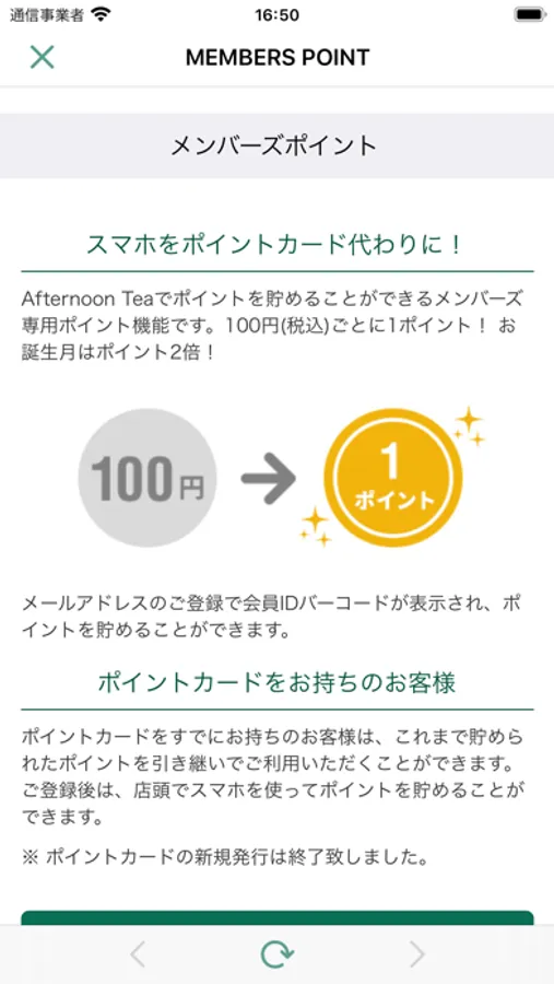 メールアドレスの登録で、本日からAfternoon Teaの店舗でお買い物やご飲食でポイントを貯めることができます。