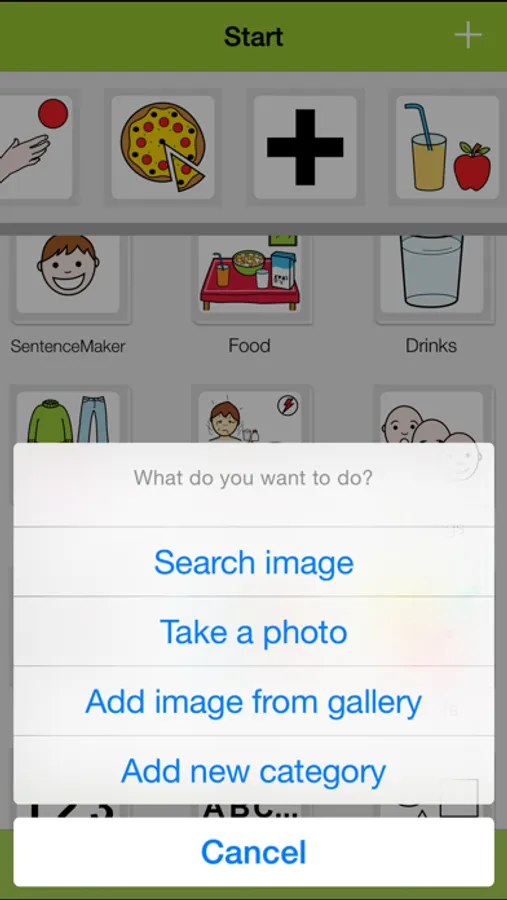 The image database of LetMeTalk contains more than 9,000 easy to understand images from ARASAAC (http://arasaac.org). Additionally, you can add existing images from the device or take new photos with the build in camera.