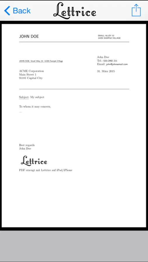 Lettrice features an easy-to-use input form without the hassle of a big office software. Just enter your text and click "Save" to produce a PDF which can be sent by email or printed directly from your iPhone or iPad.
