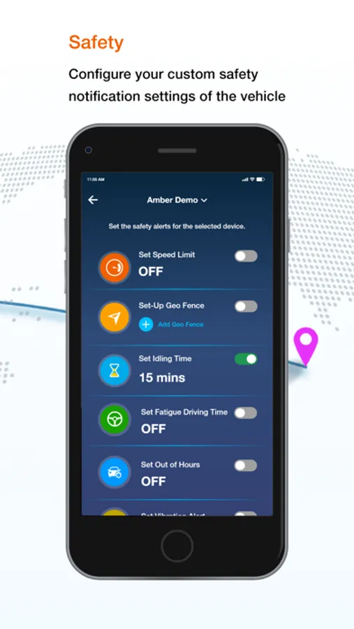 Geo Fencing, Idle time notification, speed limit notifications, Ignition on/off notification**, Fatigue driving time notification, Vehicle engine health diagnostics*, Remote Engine cut off**