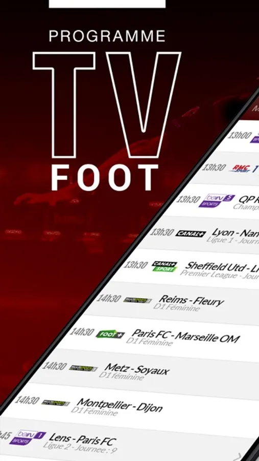Elle vous permet de retrouver tout le programme TV foot sur sept jours, le programme télé foot de votre ligue,de votre équipe favorite ou encore d'une chaîne en particulier ! Que ce soit les matches, les émissions, les magazines, en différé ou en direct... tout est sur l'application, et ce quelle que soit les chaînes.
