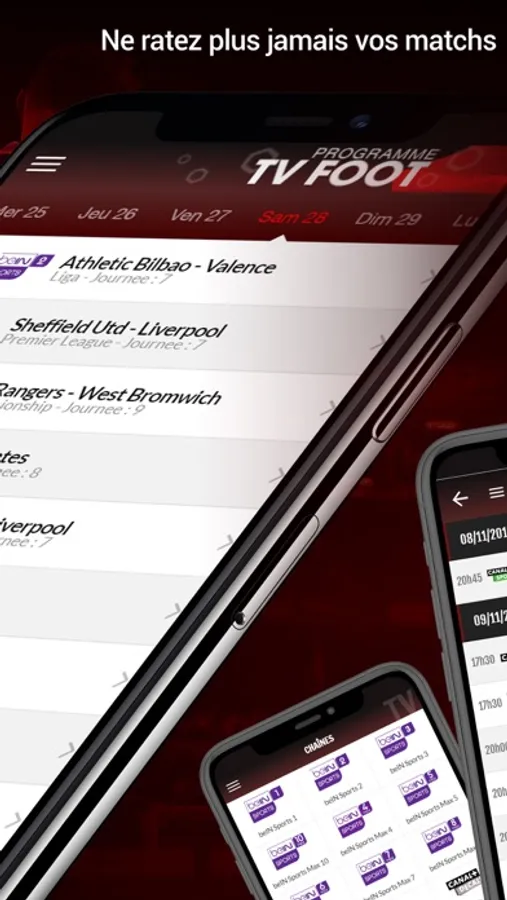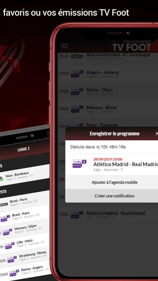 - La possibilité de programmer une alerte dans votre calendrier ou de demander une notification pour vous servir de rappel avant que votre émission de foot ne commence !