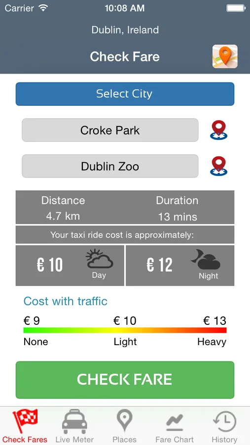 This app help to check taxi fares in all major cities in Ireland. You can check fares for any two places while sitting at home or office. It also shows path between source and destination address.
