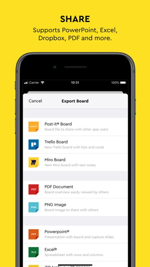 • Share to your favorite formats and cloud services to continue working on your ideas digitally—supports Miro, Trello, Dropbox, PowerPoint, Excel, PDF, and more.