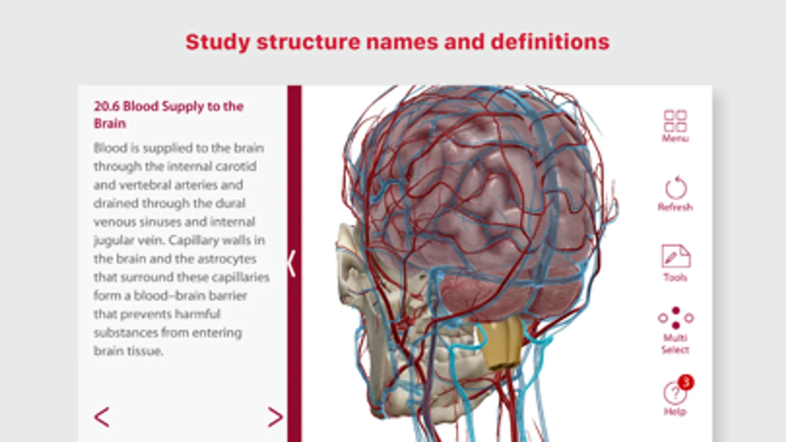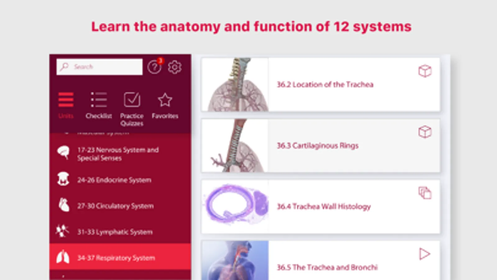 This app includes 12 units with 50 chapters/modules that use over 500 preset views of 3D models, more than 150 illustrations and animations, dozens of histology slides, and hundreds of quiz questions.