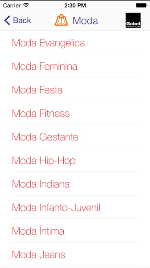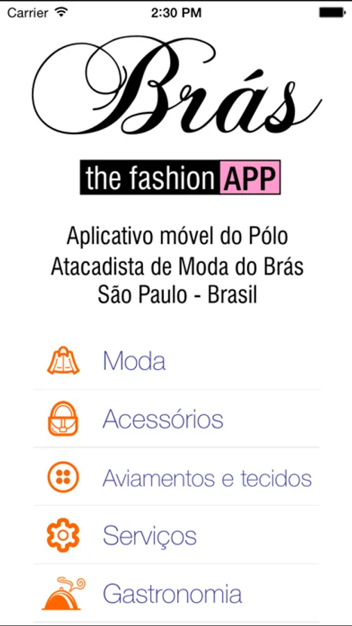Dividido nas categorias Moda, Acessórios, Serviços, Gastronomia, Aviamentos e Tecidos para facilitar a sua navegação.