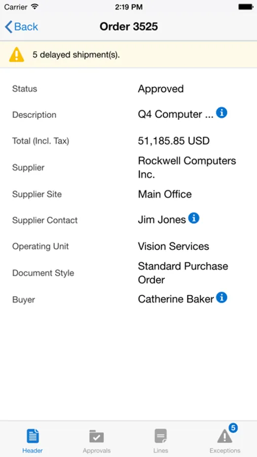 - View purchase order, approvers, lines, shipments, distribution and requester details