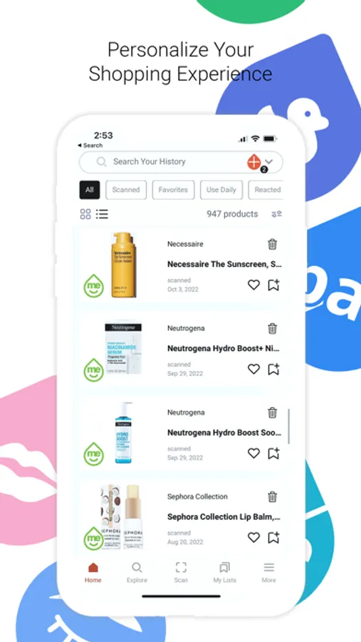 Keep track of all your products and experiences in one place. Make sure you're using safe and healthy personal care products by storing a history of products you've scanned, submitted, shared, sampled, or reacted to.
