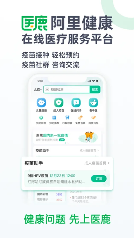 阿里健康全新升级为医鹿,为您提供可信赖的在线医疗服务。儿童及成年人疫苗贴心推荐,接种提醒守护全家健康,HPV9价/4价在线抢苗,新冠/流感等成年人疫苗在线预约,宝宝打针,提前预约不排队,疫苗百科查询,医生审校权威认证。1元义诊全面上线,1元问诊全科疾病,权威医生专业解答。全面为用户提供7*24小时在线极速问诊、三甲好医生咨询、便捷本地医院等服务,汇集海量名医权威信息,还能体验挂号&体检&购药等健康管理一站式生活服务,是全家的健康助手。