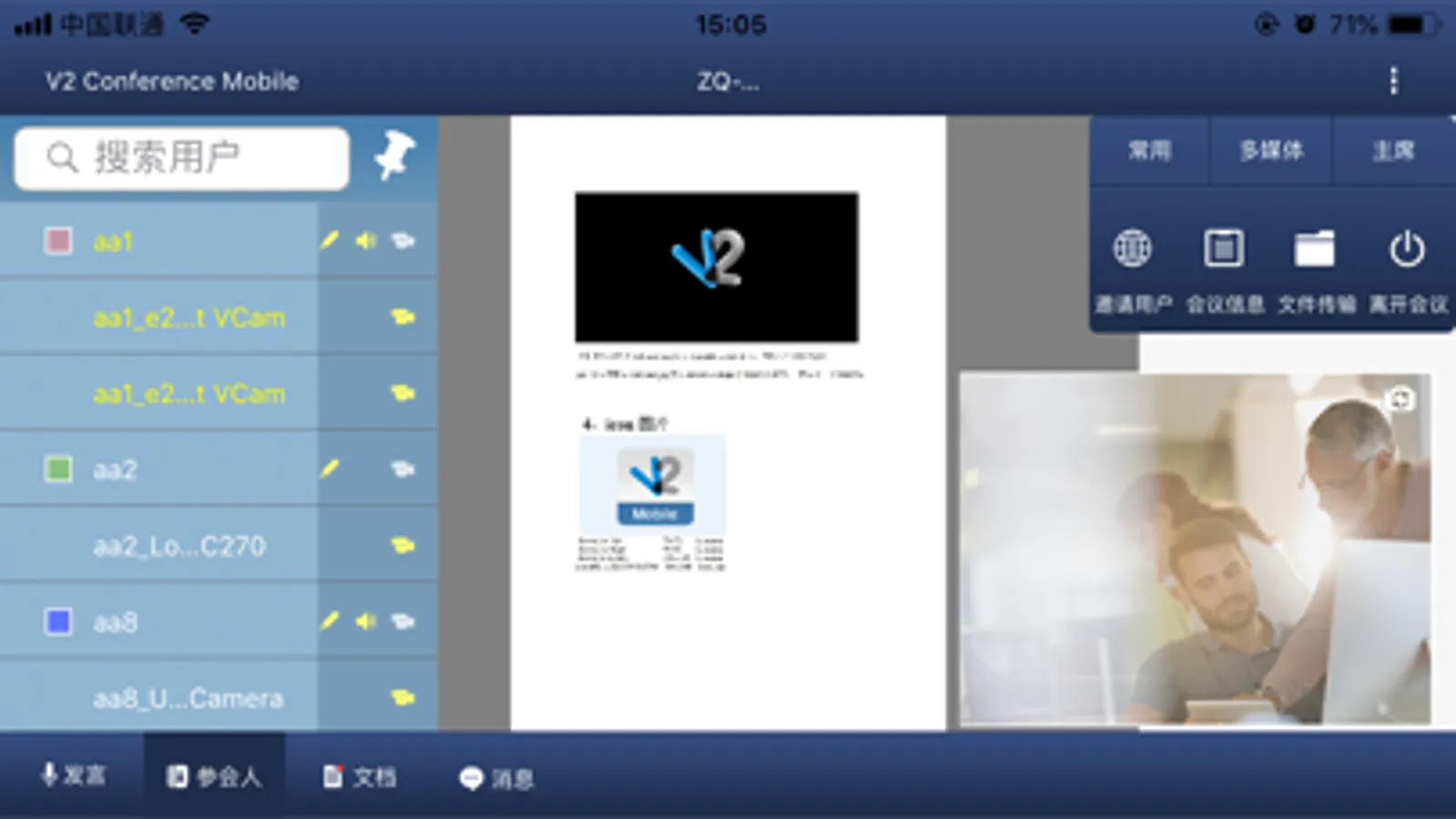 This app is a client of our v2Meet system, it runs both on iPhone and iPad(iOS software version should be at least 5.0). Certainly, it can touch with other people in realtime, including watching each other's video, talking with each other and watching other's shared documents. It runs fine on Wifi or 4G network.
