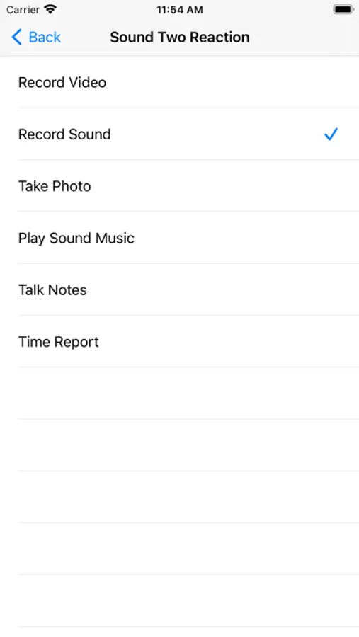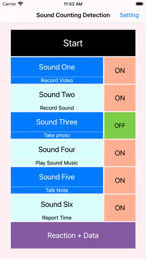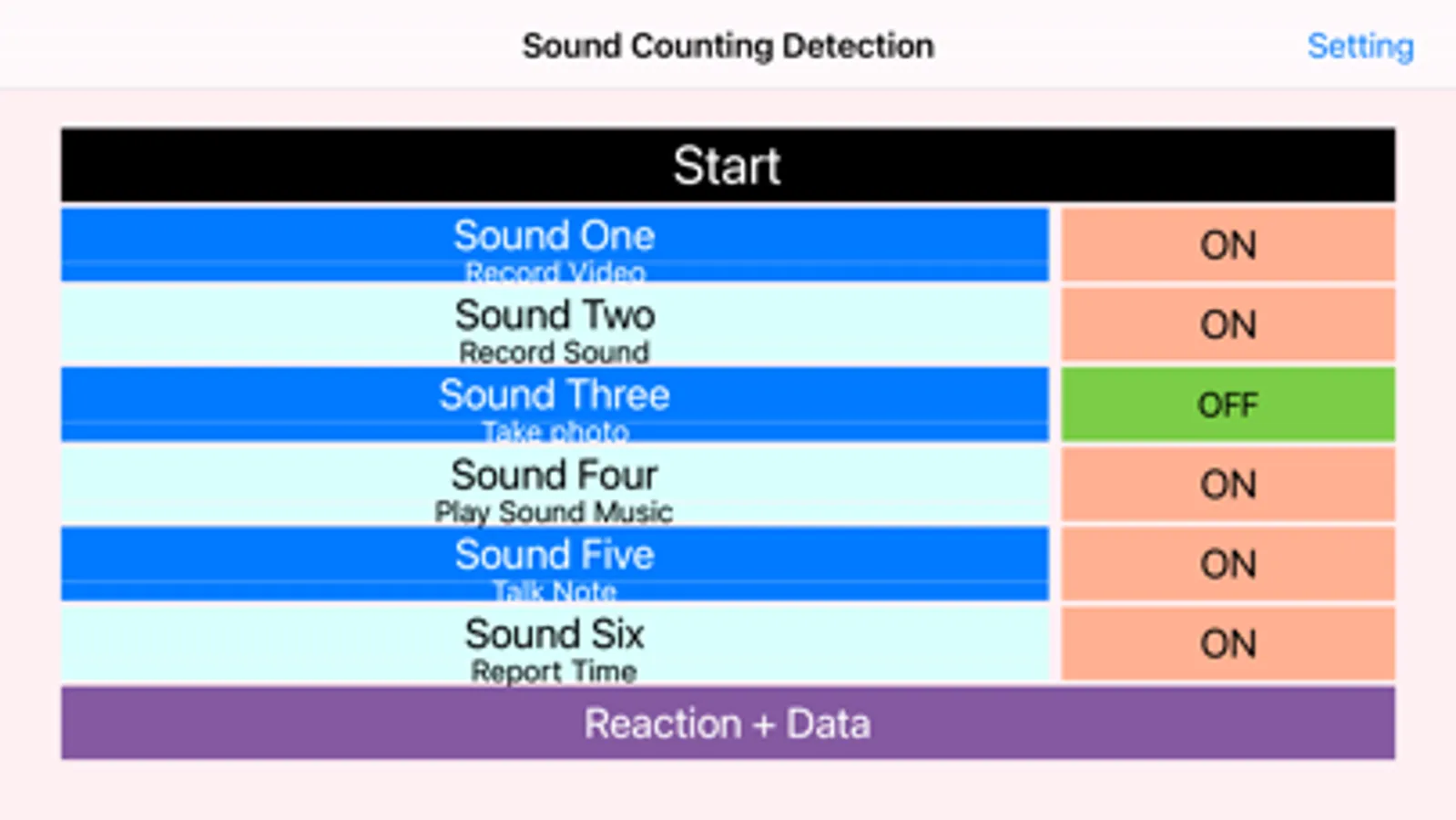If we just use this app for the first time, according to the default preferences: the reaction for Sound One is to record video, the reaction for sound two is to record sound, the reaction for Sound three is to take photo. The reaction for Sound four is to play sound music. The reaction for Sound five is to talk note. The reaction fo Sound six is to report the current time.