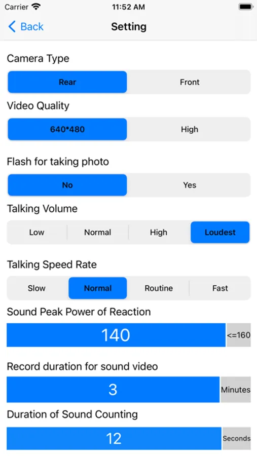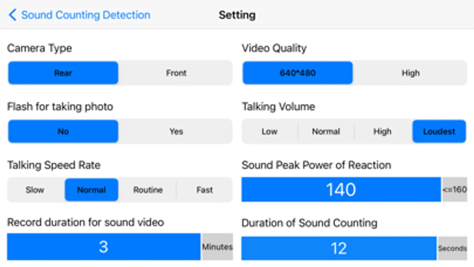 From the setting view, we could select to use the front camera or rear camera. we could set the duration for recording sound or recording video. we could set the detected pitch level of sound. Only the sound pitch is higher than the level we indict, the sound will be counted.